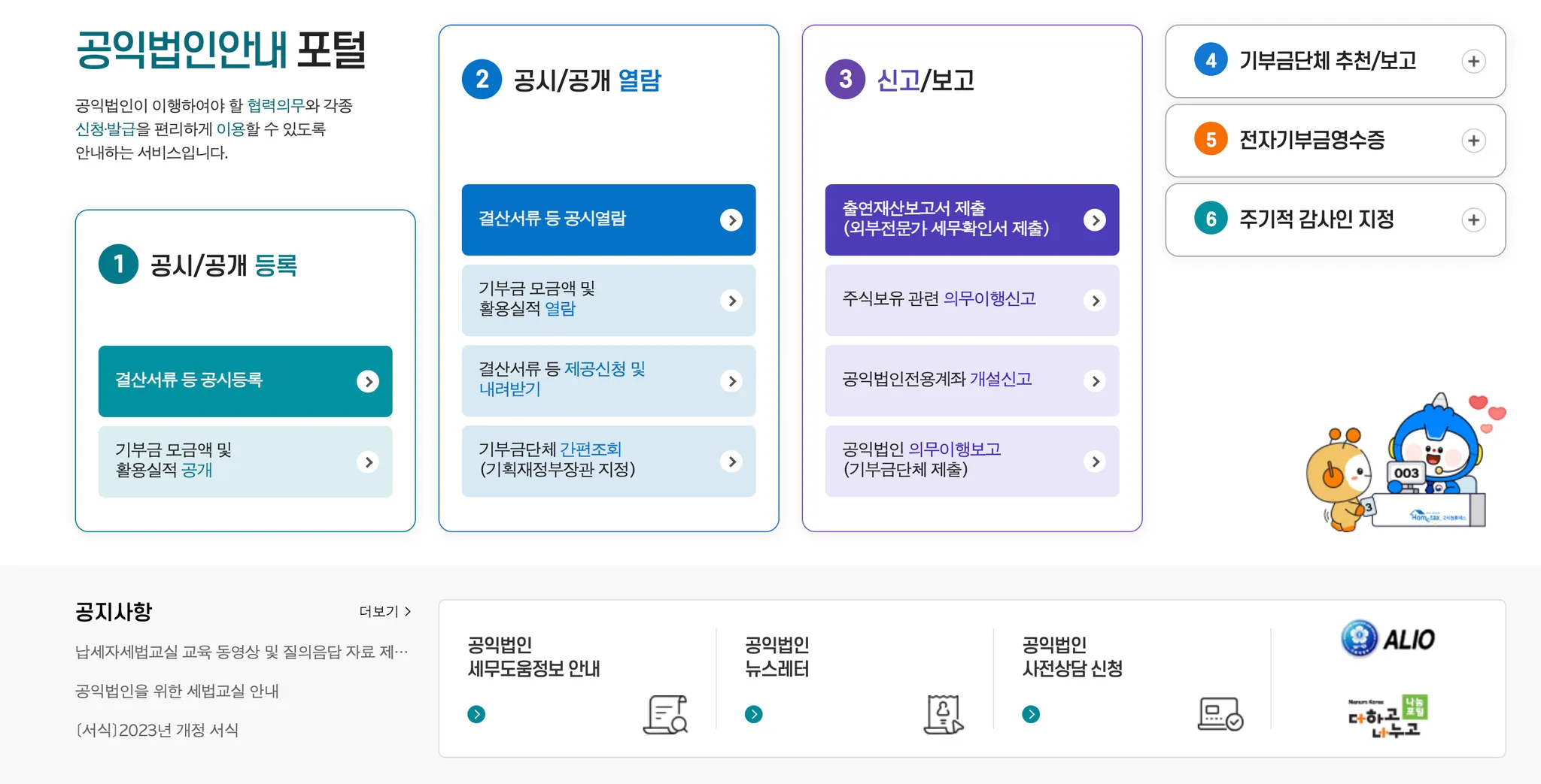 국세청에서는 공익법인을 대상으로 공시제도를 실시하며, 기부자의 접근성을 높이기 위해 2023년 ‘공익법인안내 포털’ 운영을 시작했습니다. 포털에서는 기부자가 쉽게 결산 서류를 열람하고, 법인이 간편하게 보고할 수 있습니다.