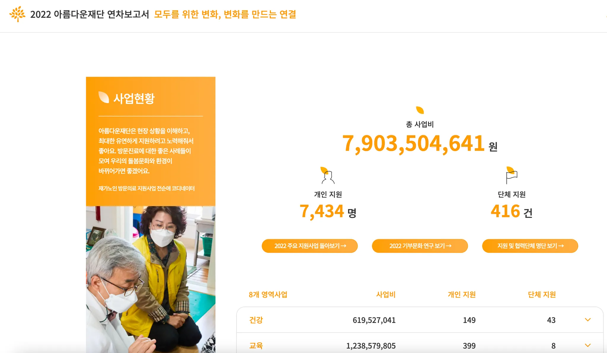 아름다운재단에서는 다음과 같이 웹페이지를 통해 연차보고서를 살펴볼 수 있도록 제공해요. 사업 현황, 모금 현황에 관련된 수치를 제시하고요. 주요 사업과 관련된 사항을 보고하고 있습니다. 아름다운재단에서는 특별히 연차보고서를 목소리로 담은 오디오 연차보고서를 제작하고 있어요. 청해에 익숙한 사람들이 더 편리하게 접근할 수 있도록요.