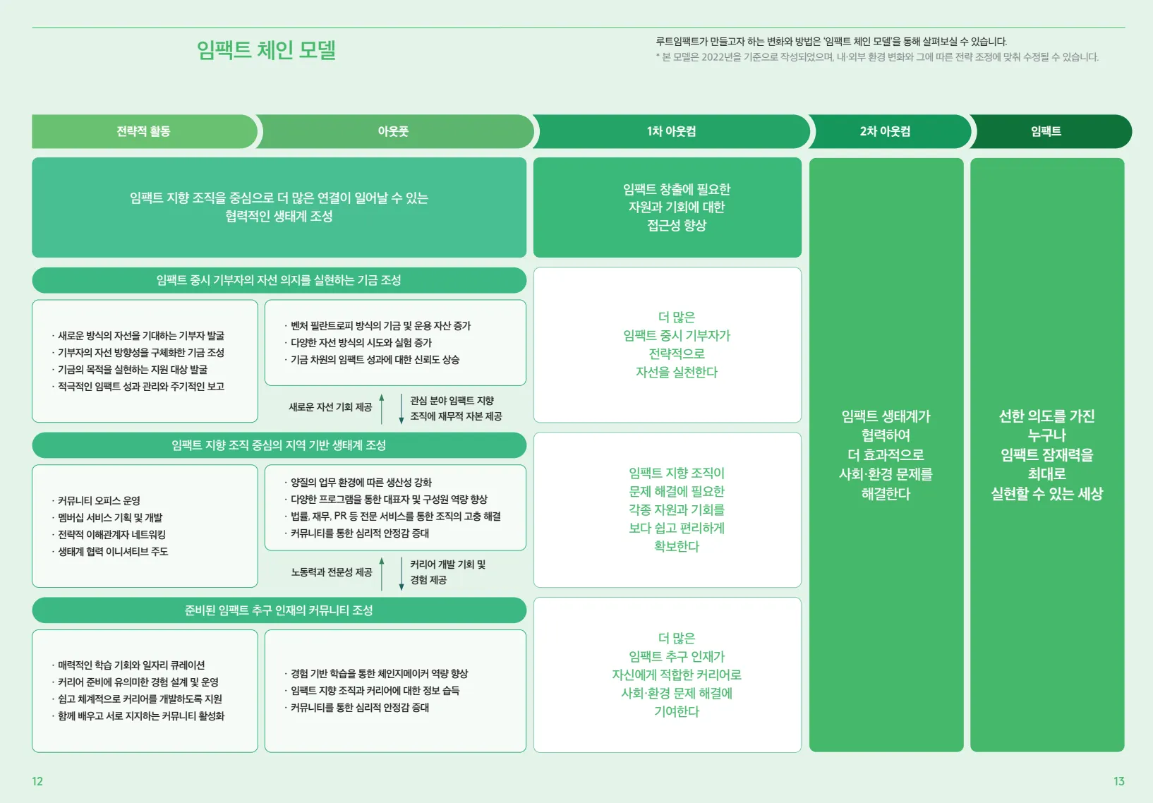 루트임팩트의 연차보고서입니다. 연차보고서는 단순히 사업 성과와 기부금 사용 내역을 보고할 뿐 아니라, 단체의 비전과 방향성을 기부자와 공유하는 기회이기도 해요. 단체가 미션을 성취하기 위한 전략에 관해 설명하고, 기부자들이 더 비전에 몰입하고 지지할 수 있도록 합니다. 나아가 기부자들의 질문을 정리해 답을 달아서 여러 궁금증을 해소하기도 해요. 이처럼 연차보고서는 기부자와 기부단체가 소통하는 자리예요.