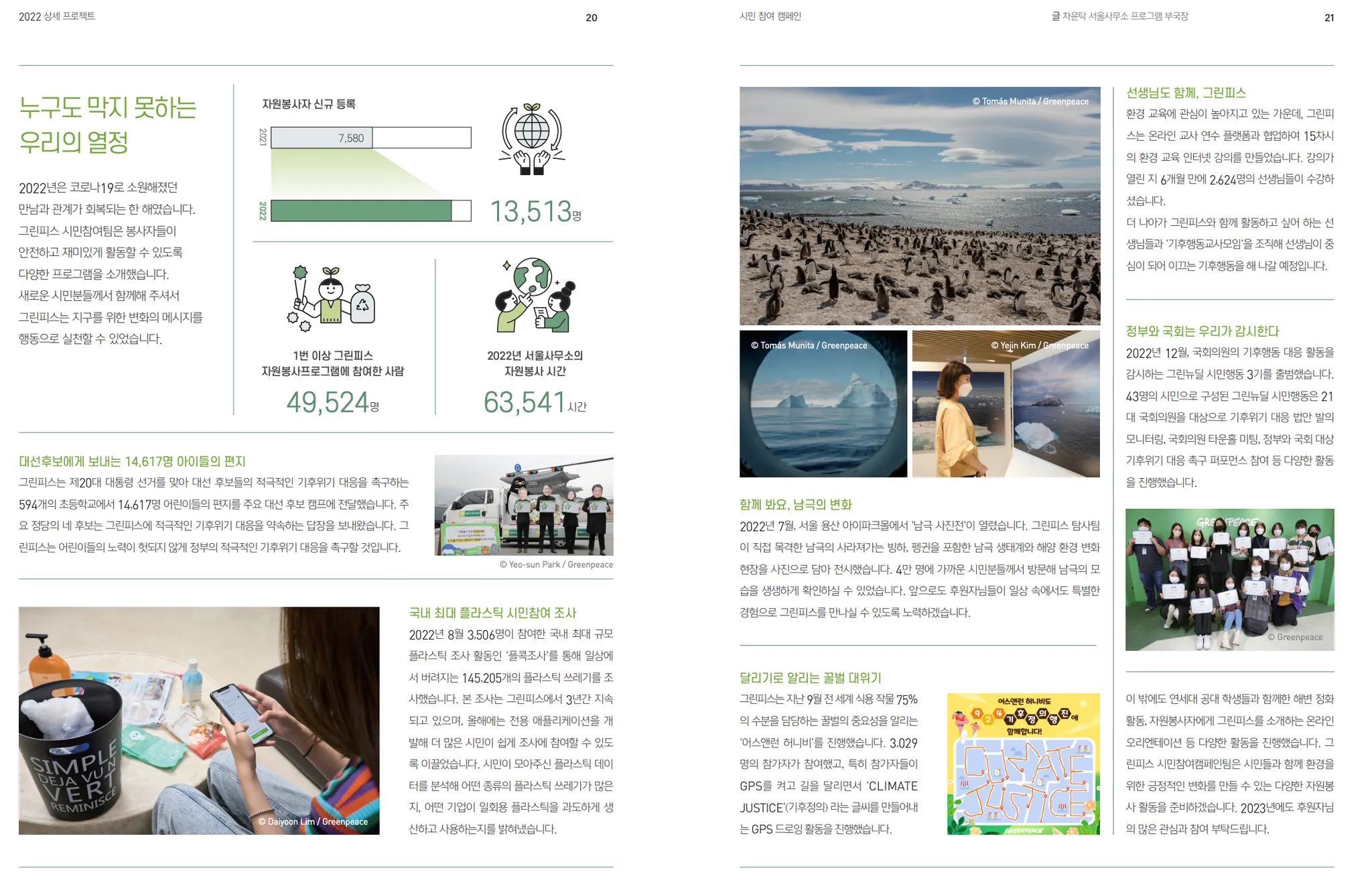 그린피스에서 발행하는 연차보고서예요. 재정보고서와 연차보고서를 나누어 작성해 기부금 사용 내역과 성과를 상세히 밝히고 있어요. 정기 기부자의 기부금 사용 내역을 간단한 도표로 밝혀 공개하고, 사업 현황을 자세한 사진과 수치로 함께 작성해 보여줘요. 특히, PC와 스마트폰의 독해 방식이 다른 점을 고려해 스마트폰 환경에 적합한 연차보고서를 별도로 작성하여 공개하고 있어요.