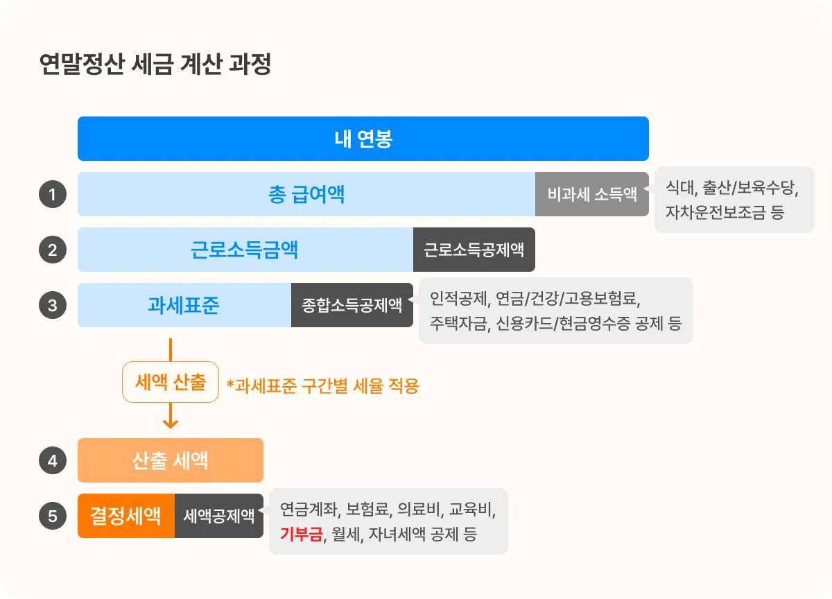 연말정산 단계는 크게 세율을 적용하기 전, 나의 소득에서 공제하는 ‘소득공제’, 세율을 적용한 뒤 산출된 세액에서 공제하는 ‘세액공제’ 단계로 나뉘어요. 이때 기부금 공제는 ‘세액공제’ 방식이에요.